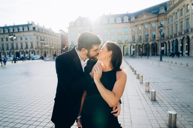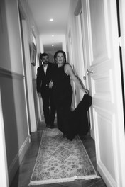 Ils sont à Paris pour quelques heures encore, juste assez pour goûter à la lumière particulière des lieux, se glisser dans l’ombre douce d’un appartement haussmannien du 8ème. Elle, dans sa robe noire et longue, s’abandonne à la lumière qui se glisse entre les rideaux, sa silhouette flirtant avec le soleil d'hiver. Lui, veste entrouverte, un sourire qui naît dans l’air, comme s'il savait quelque chose qu'on ignore. Il y a ce piano, silencieux, qui attend. Il y a les couloirs étroits où l’on se perd sans regret, et cette table dressée comme une pièce centrale d'un film de Wes Anderson. Et puis le grand escalier de l'immeuble centenaire qui avale les escapades avec un appétit féroce.